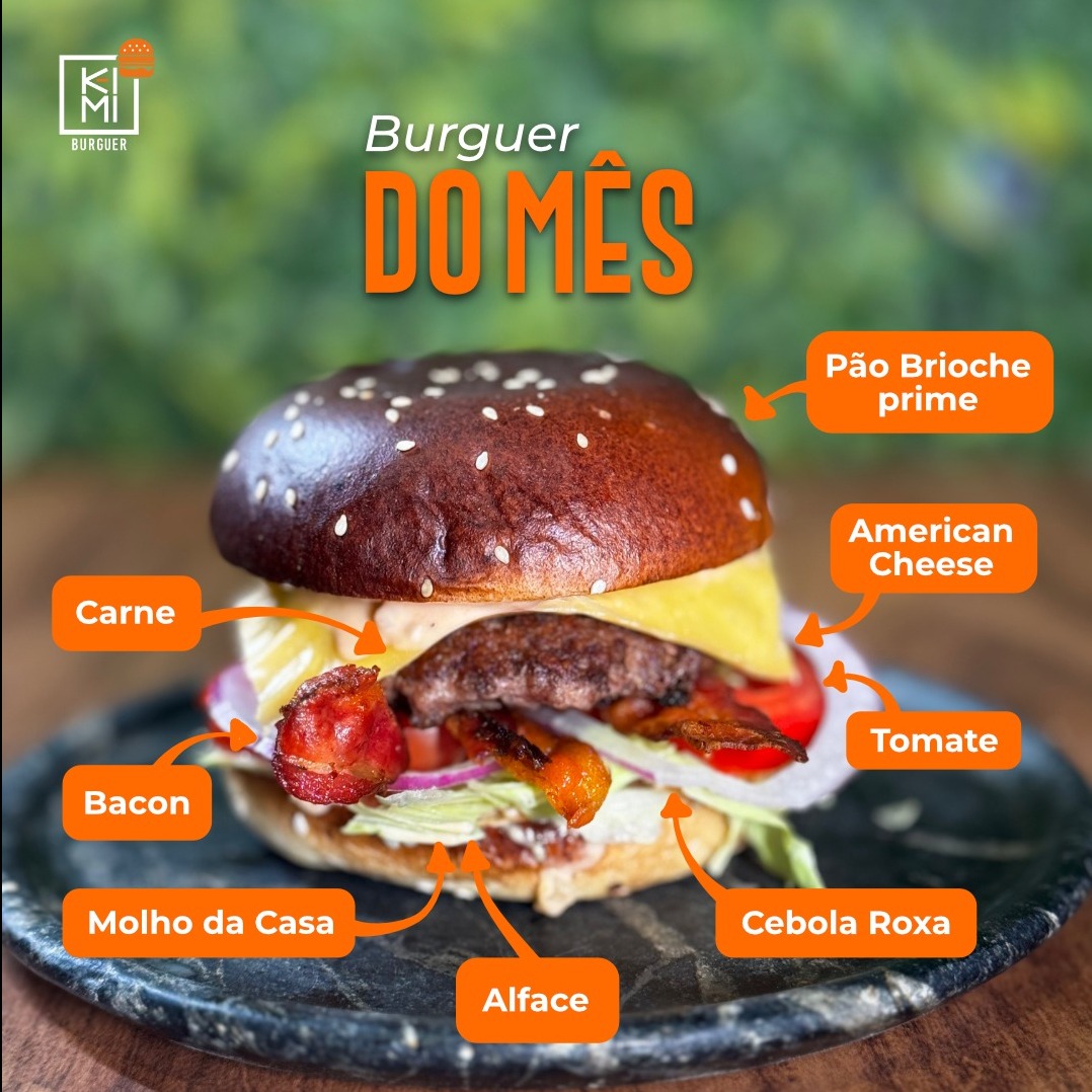Pão brioche + Blend + American cheese + Tomate + Cebola roxa + Alface + Molho da casa + Bacon.